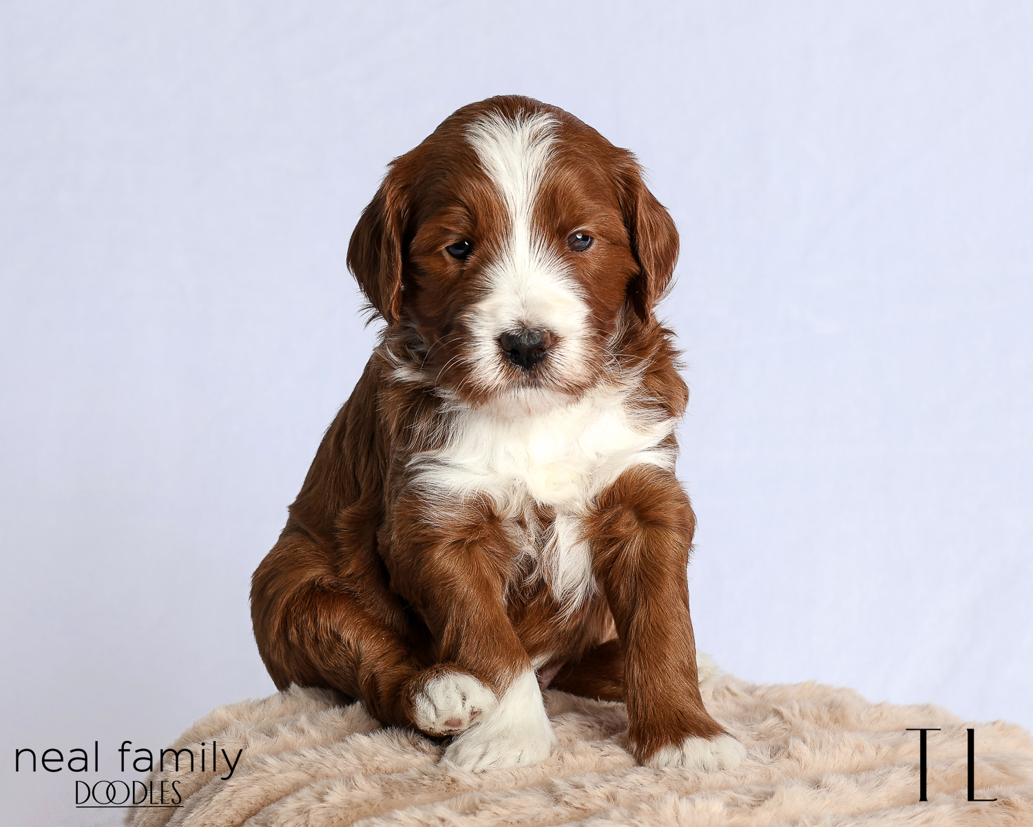 The goal of this breeding was to produce mini to small medium puppies with red/apricot and red/apricot with white markings that have a traditional teddy bear doodle face with wavy to genetically straight/shaggy proper coats.