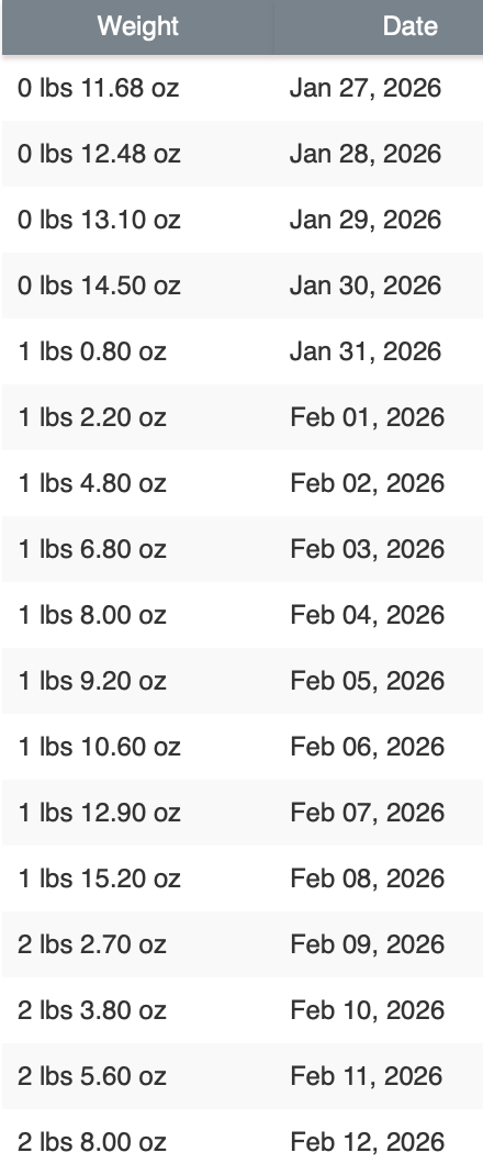 - 2 lbs 3.8 oz 02/10/2026 TWO WEEKS