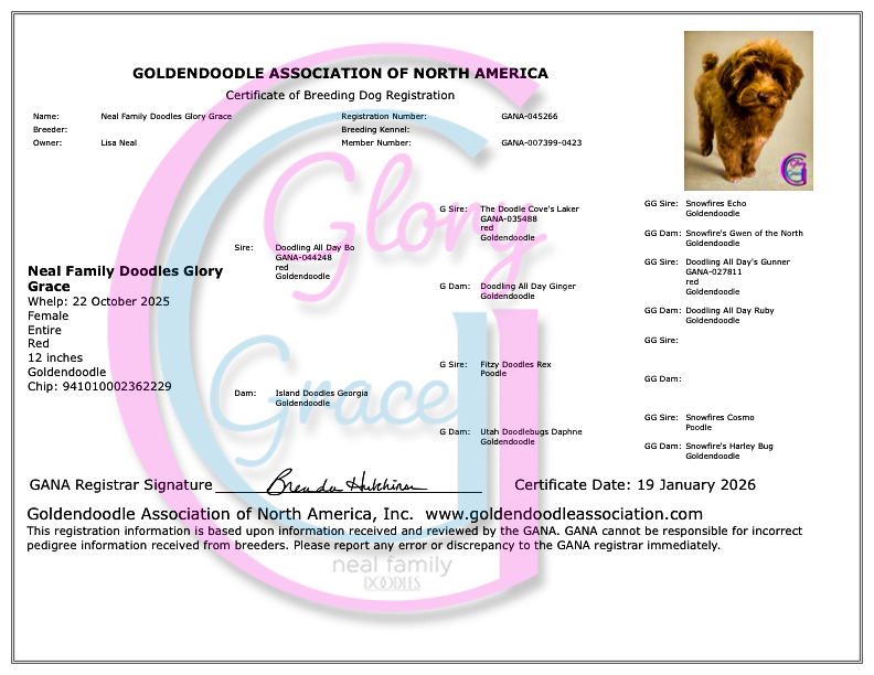 Her name reflects the heart of our program at Neal Family Doodles — puppies raised intentionally in our home with patience, gentle guidance, and early socialization to build confident, well-adjusted companions.