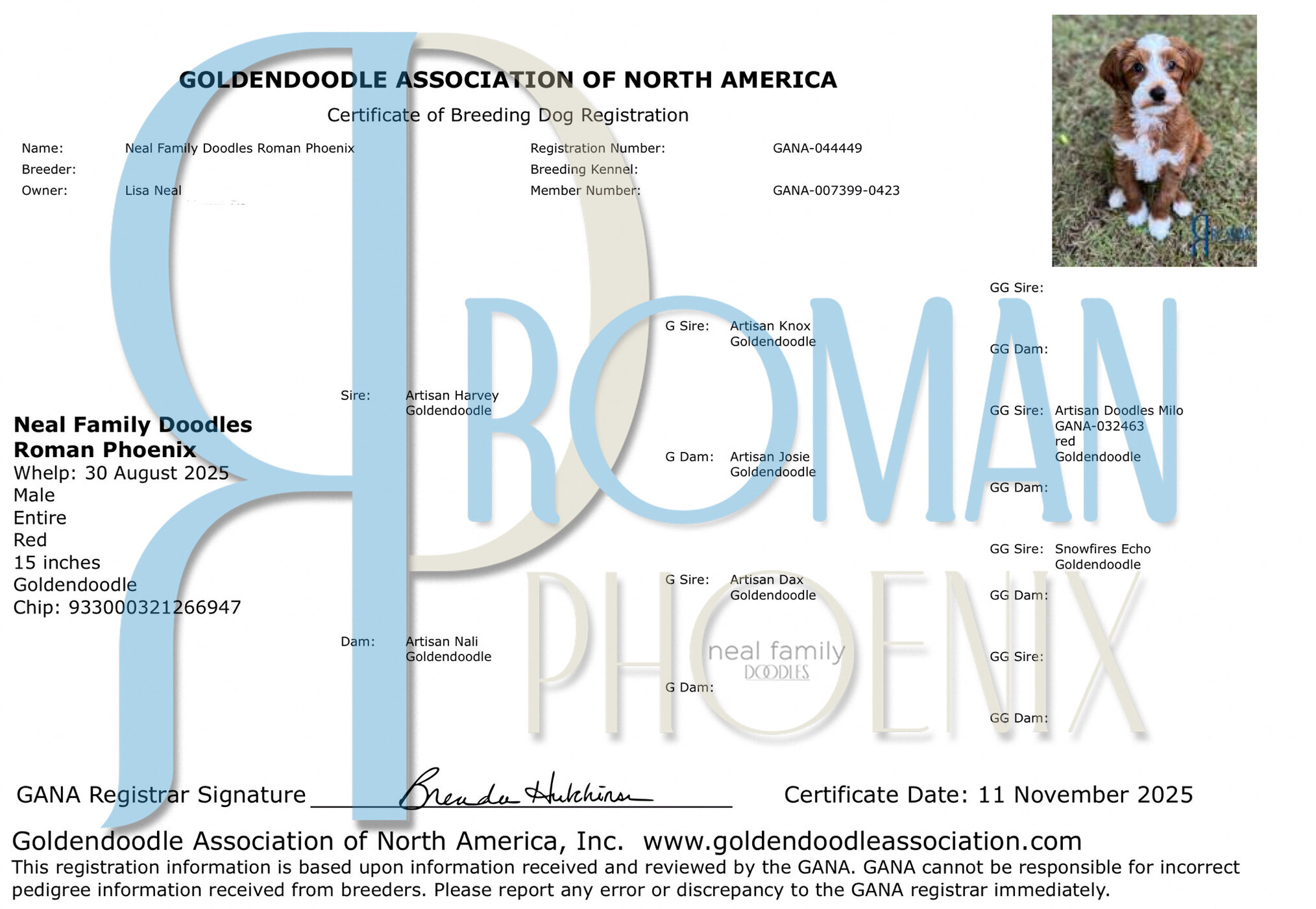 We have high hopes for Roman Phoenix and cannot wait to watch him grow, develop, and eventually contribute his outstanding qualities to the future of Neal Family Doodles.