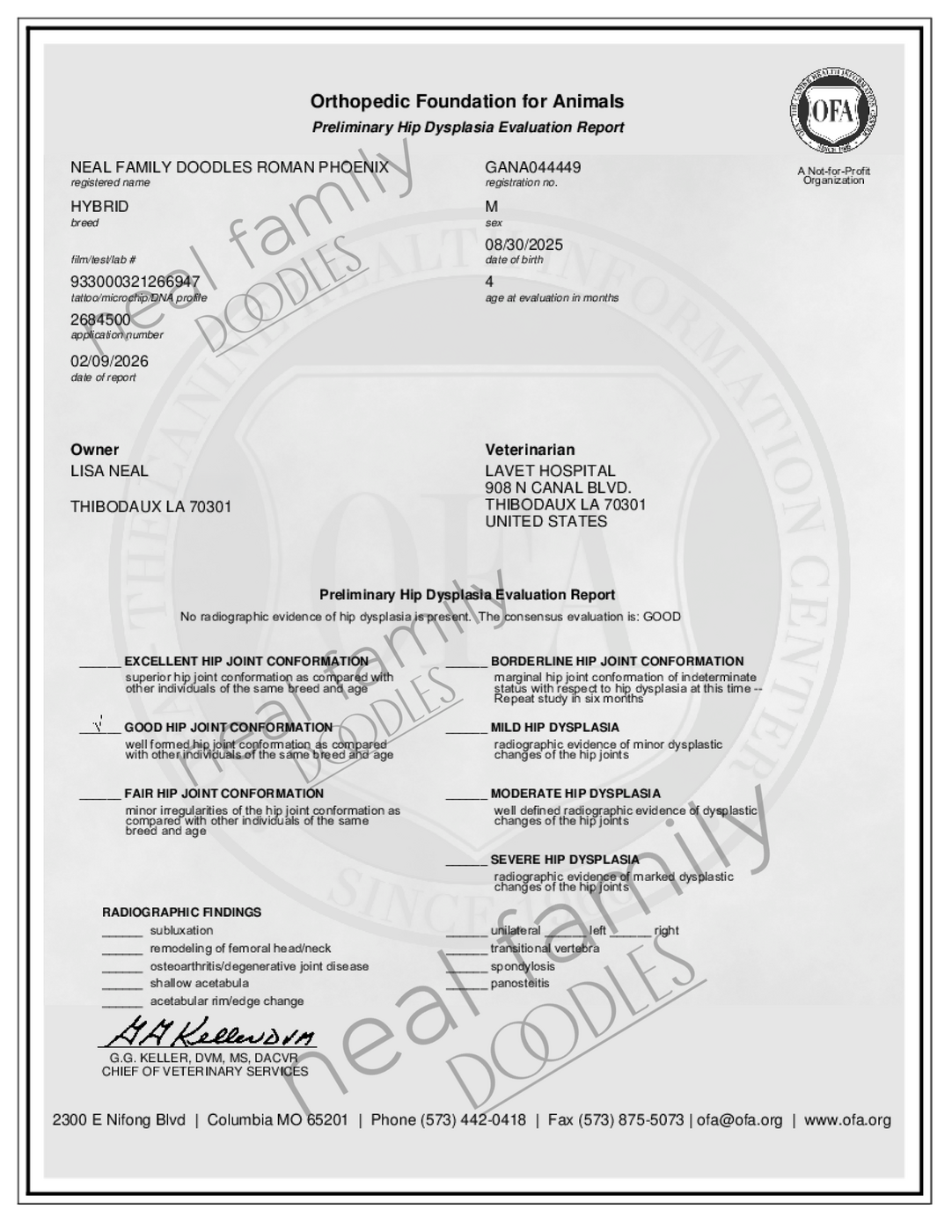 - Hip Dysplasia: Good OFA